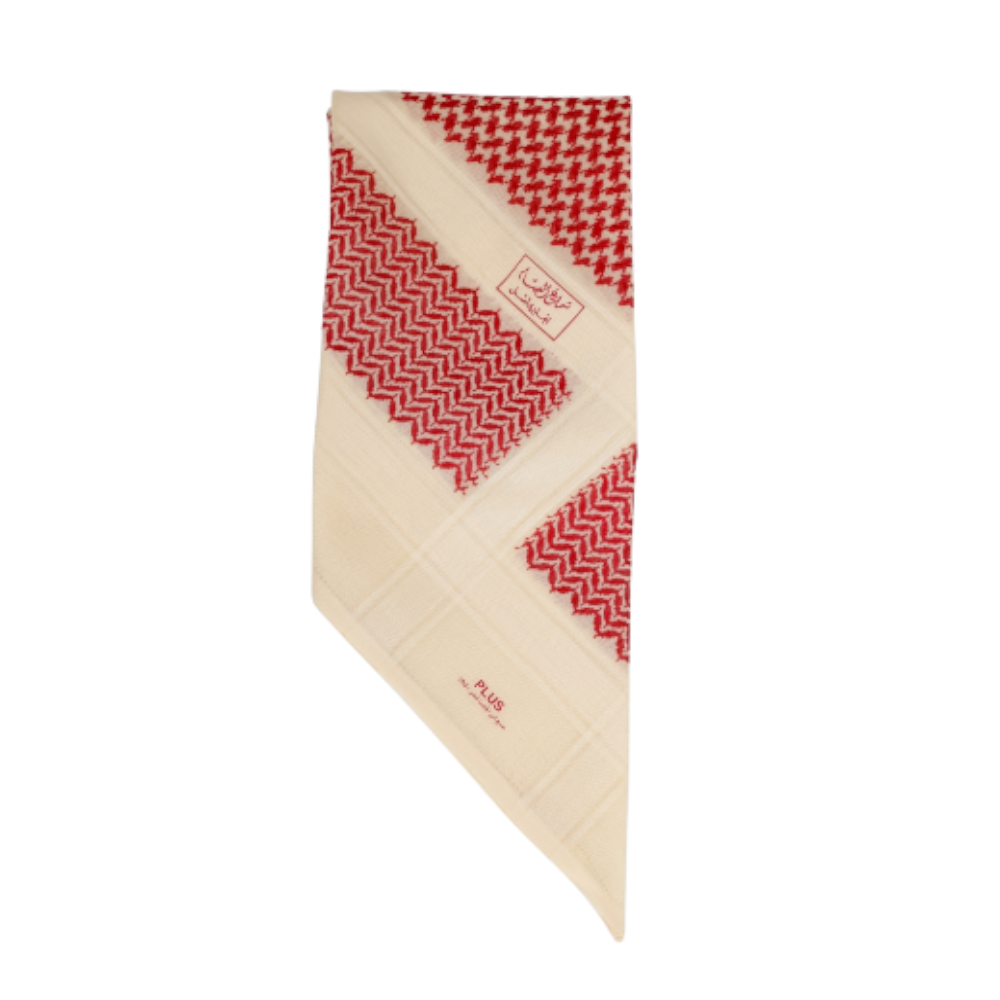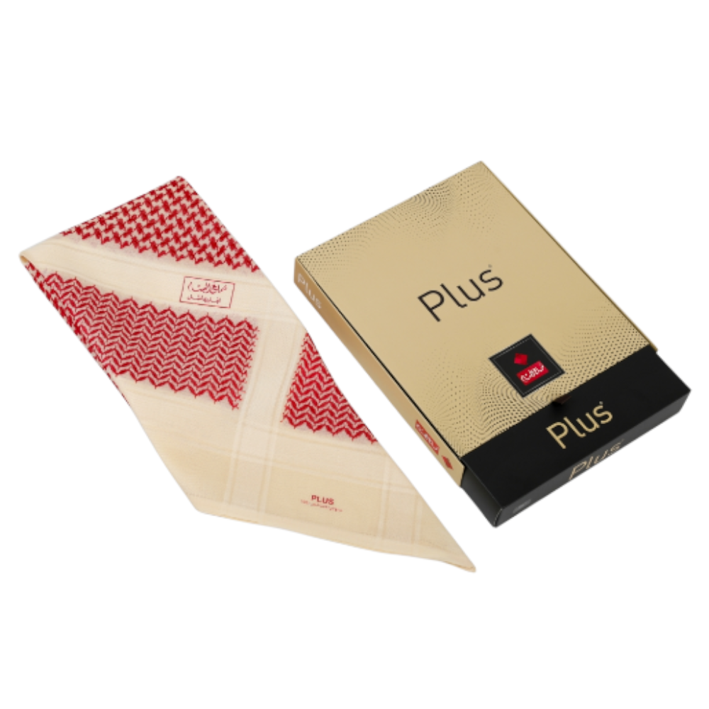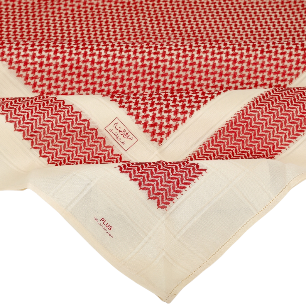 شماغ بلس البسام أحمر على بيج ، بتصميم أنيق وألوان نقية تعطي شعورًا بالفخامة والرقي.