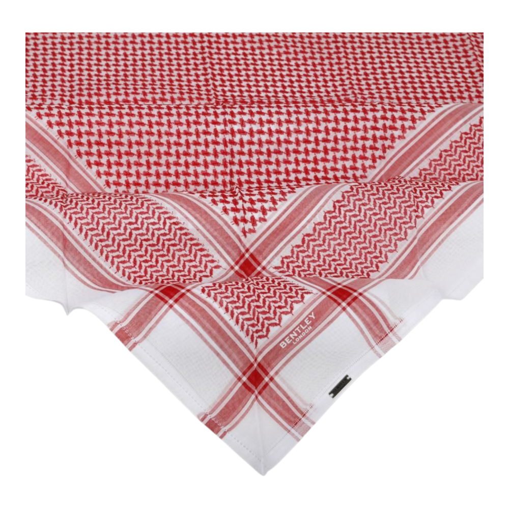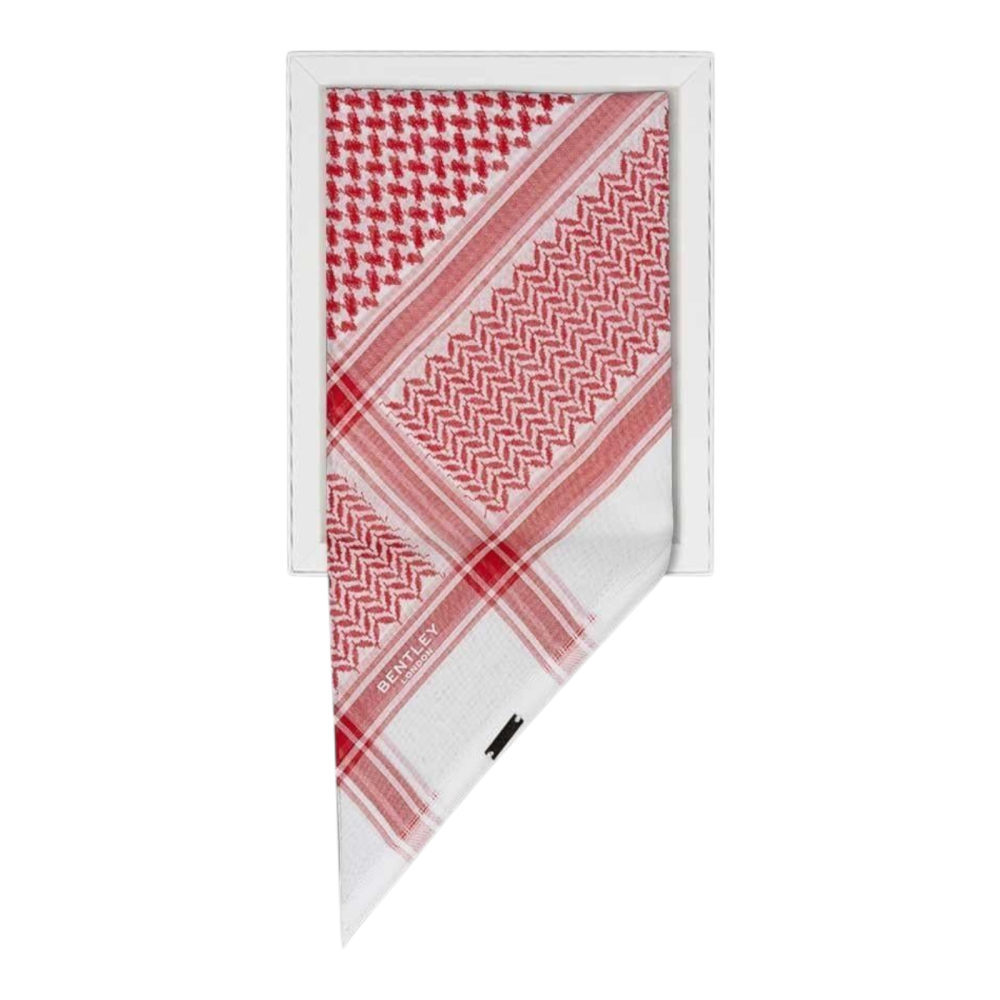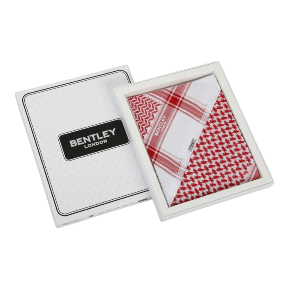 - علامة بنتلي الشهيرة مطبوعة بلون أبيض مع علامة معدنية تحمل اسم الماركة بأسفل الشماغ.