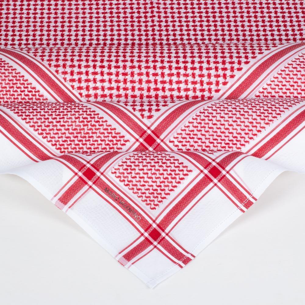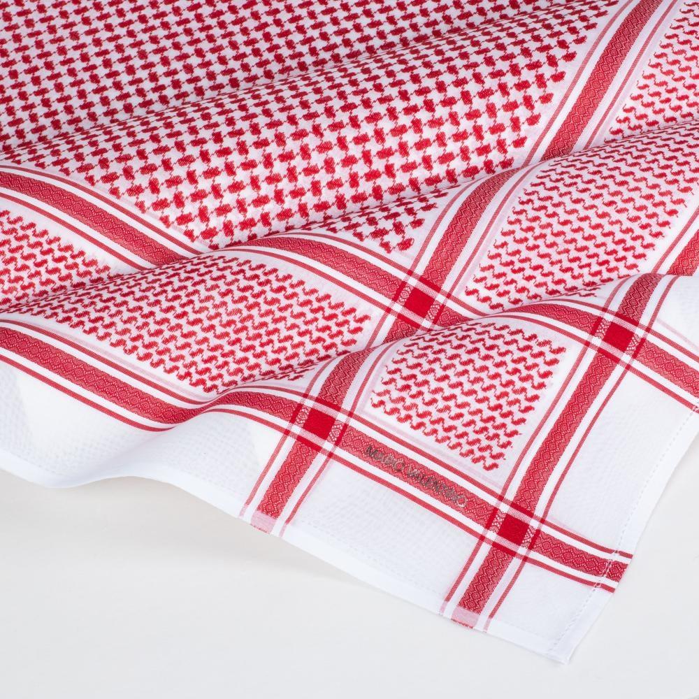 شماغ بتصميم عربي أصيل مصنوع من خامات عالية الجودة يدخل في تصنيعه خيط من القطن الصافي 100% مصبوغ بلون أحمر ذو صبغة ثابته وباللون الأبيض الناصع مع ختم أصلي واضح لشماغ ماريو فالنتينو با للون سلفر فضي .
